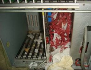 二、築巢力-老鼠們侵入建築物後,可遮風避雨又無天敵,只要找個陰暗角落,即可築巢養育下一代。鼠害防治人員亦曾在通信交換機、廚房的冰箱發電機及電箱內發現鼠窩。若在居所內發現有些布類、紙類甚至塑膠袋不翼而飛,可能是被老鼠取去築巢舖設育兒的墊子了,因為我們常在鼠窩發現這些東西。