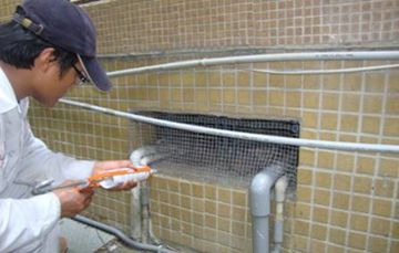 三、封堵阻斷-利用如金屬網、發泡劑、矽力康黏著劑、鋁板等,針對各類孔洞予以封堵,亦可利用如防鼠刺刷綁在管線上來阻斷老鼠利用管線活動。但封堵受限於某些結構裝潢因素可歸納為三個條件,首要能目視的到封堵位置,次為手部得以觸及封堵位置,最後需要有一個平穩安全的工作平台才能施作。