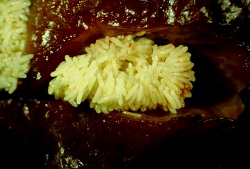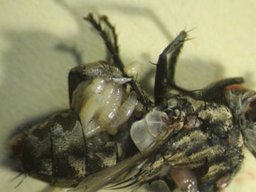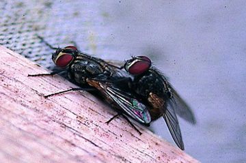 雌蠅一生中約產500個卵,卵為乳白色,長橢圓形,不到一天就孵化,肉蠅則產下已完全孵化的幼蟲,即所謂的胎生。幼蟲的發育很快,約一星期就成熟,遷徙到乾燥的地方化蛹,蛹期4~5天,所以,從卵到成蟲不到兩週時間。,羽化後5天開始產卵。