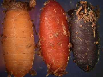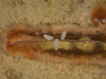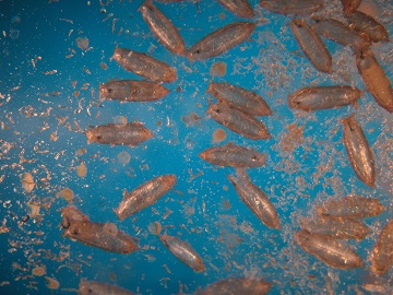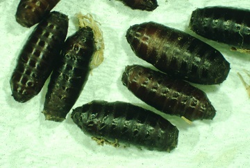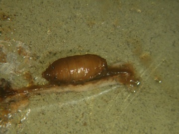 蛹會在3齡幼蟲的皮內形成,外觀像圓錐狀褐色至黑褐色,皮殼堅硬,稱為圍蛹(puparium),真的蛹在皮殼內,這也是蠅類的特徵之一。