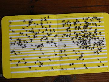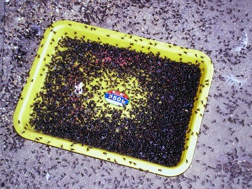 2、浸藥繩帶防治法:餐廳食品加工廠等不宜噴藥場所,利用蠅類喜歡停於稜線、細木條、電線之習性,將繩索或棉帶,浸於10-25%有機磷稀釋液,同時配合誘引劑或10%糖水,增加效果,藥劑濃度以不對蠅類產生忌避為原則。吊掛時以垂直的效果較水平好。顏色以紅、黃及暗色較佳。用量以每平方公尺用一公尺繩帶即可,效果約可維持1.5-2個月。配製方法可稱2公克50%培丹加5公克二號砂糖溶在43公克水中充分攪拌溶解(量大時可依此比例加倍配),再將細麻繩浸入兩小時拉出懸掛即可。通常夏天室內陰涼處,冬天有陽光處其效果較好,若太乾效果變差時,可噴水恢復其誘殺效果。