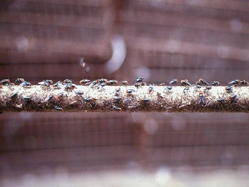 3、蠅群直接噴藥:蠅類成蟲猖獗時,在防治噴藥時必須選擇其群聚且不活動之時機進行噴藥防治。在夏天蠅類成蟲於太陽下山後,通常會大量聚集在室外之植物葉片上,線狀、網狀的雜物上休憩,由於量大且集中,為對蠅群直接噴藥的最佳時機,因此可選用有機磷劑(如:撲滅松、陶斯松)或氨基甲鹽類之殺蟲劑進行防治。在冬天夜晚成蟲則多聚集在畜舍內的屋頂、樑柱、繩線上,由於為避免影響動物,則可選用除蟲菊類藥劑(第滅寧、百滅寧、賽滅寧等)進行防治。但此法僅殺死當日的成蟲,因此為達有效抑制蠅群發生,必須搭配幼蟲防治同時進行方能奏效。